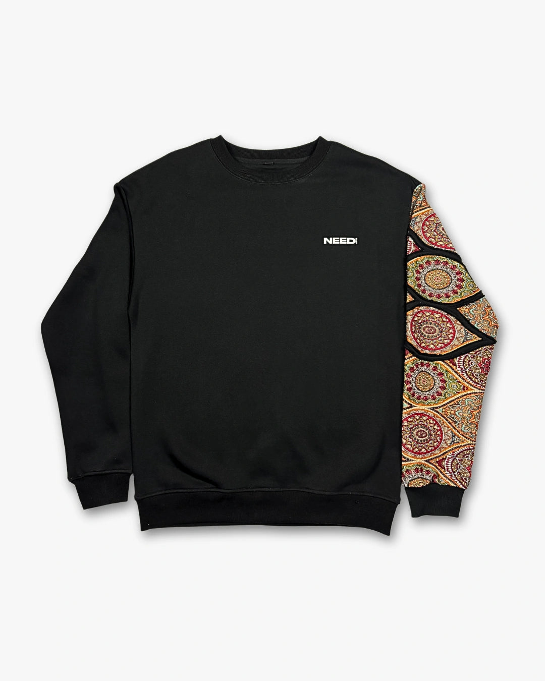 Felpa girocollo con vestibilità regolare, dal design moderno e ricercato. Sul fronte spicca il logo, mentre la manica sinistra è arricchita da un tessuto decorato con un elegante con un motivo ornamentale, aggiungendo un tocco di originalità. Un perfetto equilibrio tra comfort e stile per un look distintivo e contemporaneo.