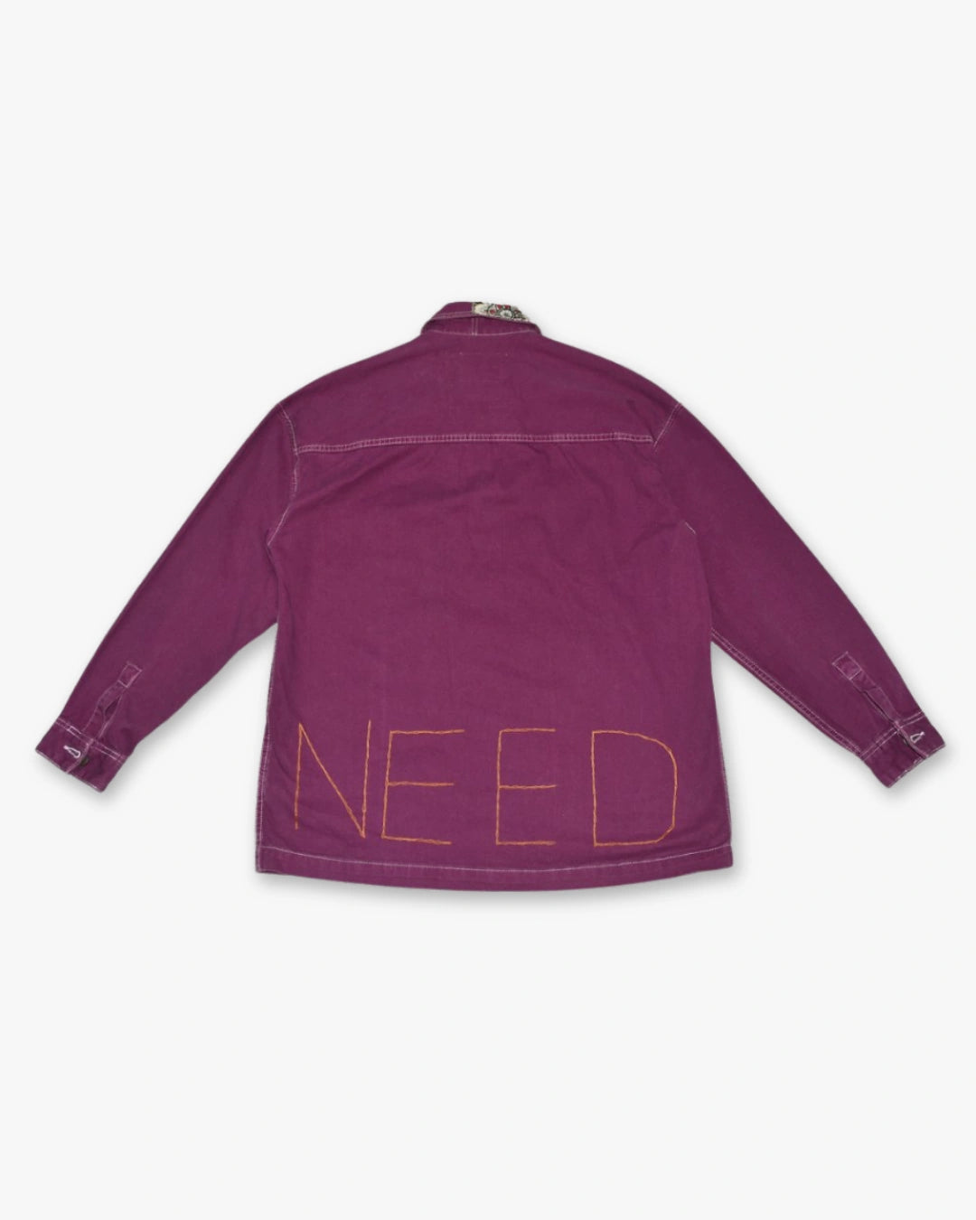 Scritta “need” nella parte posteriore con cucitura a catenella realizzata a mano.