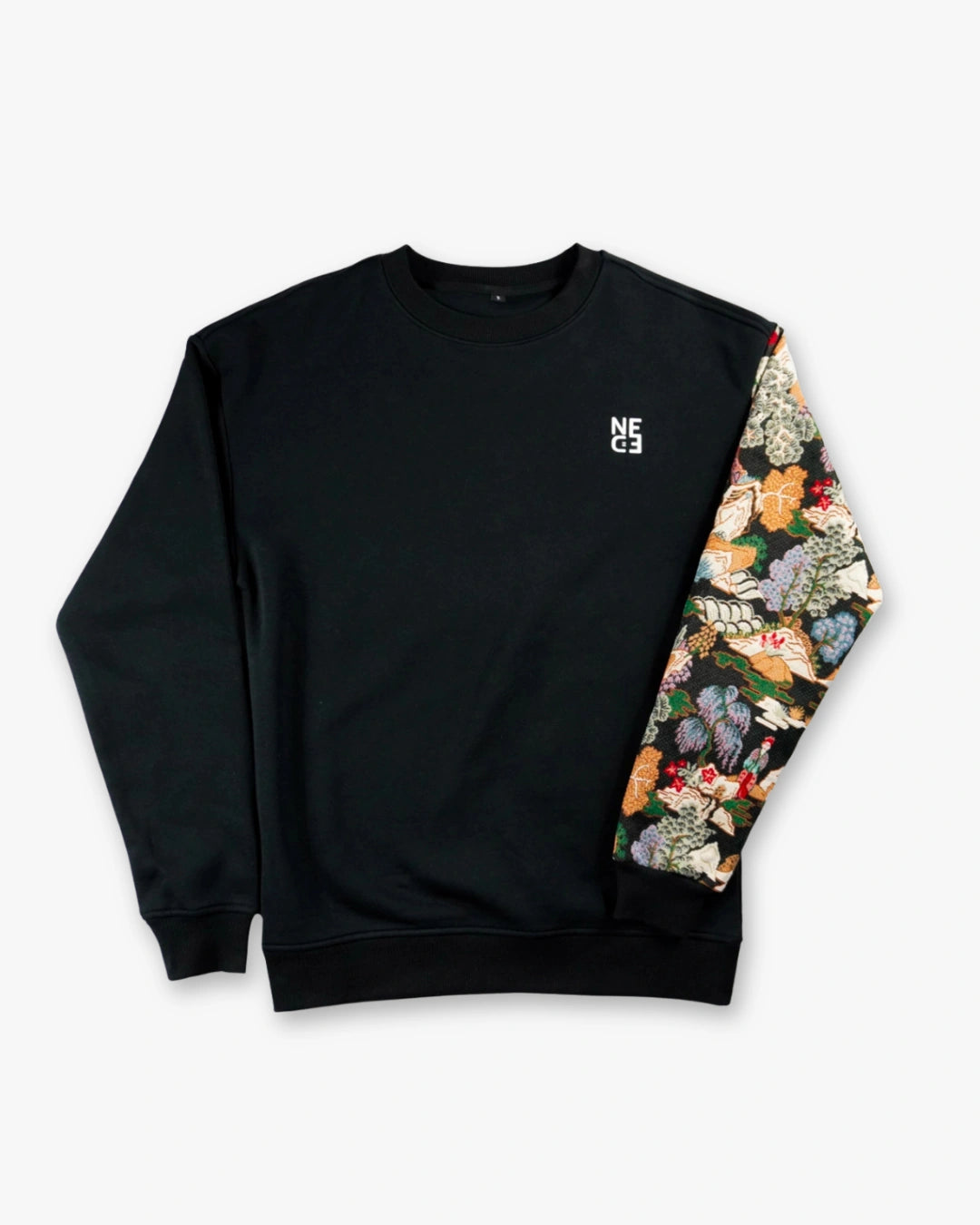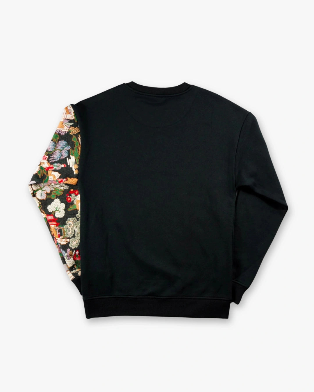 Felpa girocollo con vestibilità regolare, dal design moderno e ricercato. Sul fronte spicca il logo, mentre la manica sinistra è arricchita da un tessuto decorato con un elegante motivo ispirato a un giardino giapponese, aggiungendo un tocco di originalità. Un perfetto equilibrio tra comfort e stile per un look distintivo e contemporaneo.