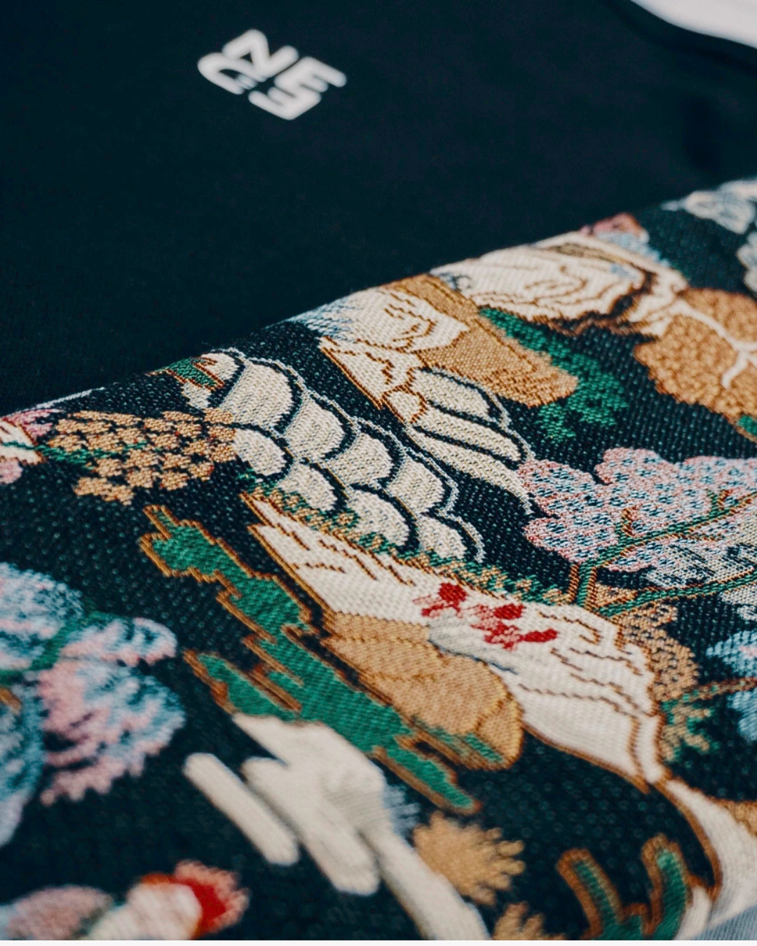 Lavorazione: Fronte: stampa con nome del brand; Retro: maschera Oni giapponese cucita, realizzata col medesimo tessuto