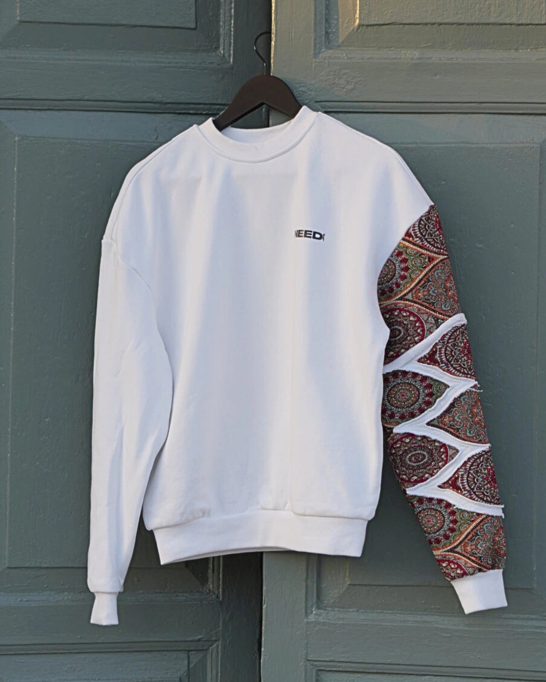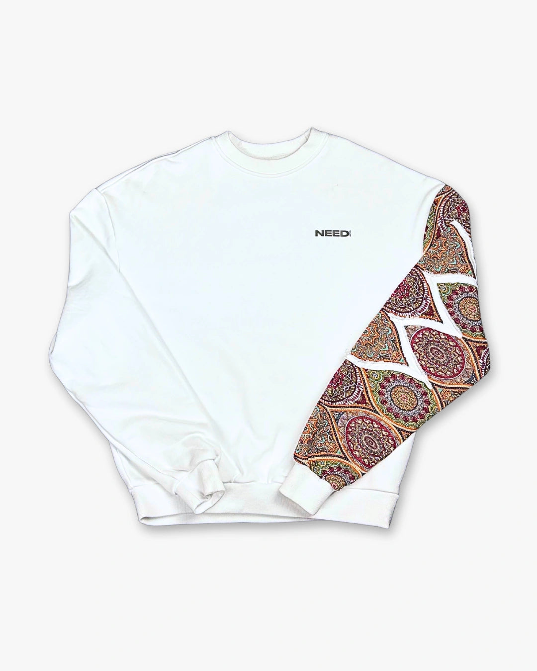 Felpa girocollo con vestibilità regolare, dal design moderno e ricercato. Sul fronte spicca il logo, mentre la manica sinistra è arricchita da un tessuto decorato con un elegante con un motivo ornamentale, aggiungendo un tocco di originalità. Un perfetto equilibrio tra comfort e stile per un look distintivo e contemporaneo.