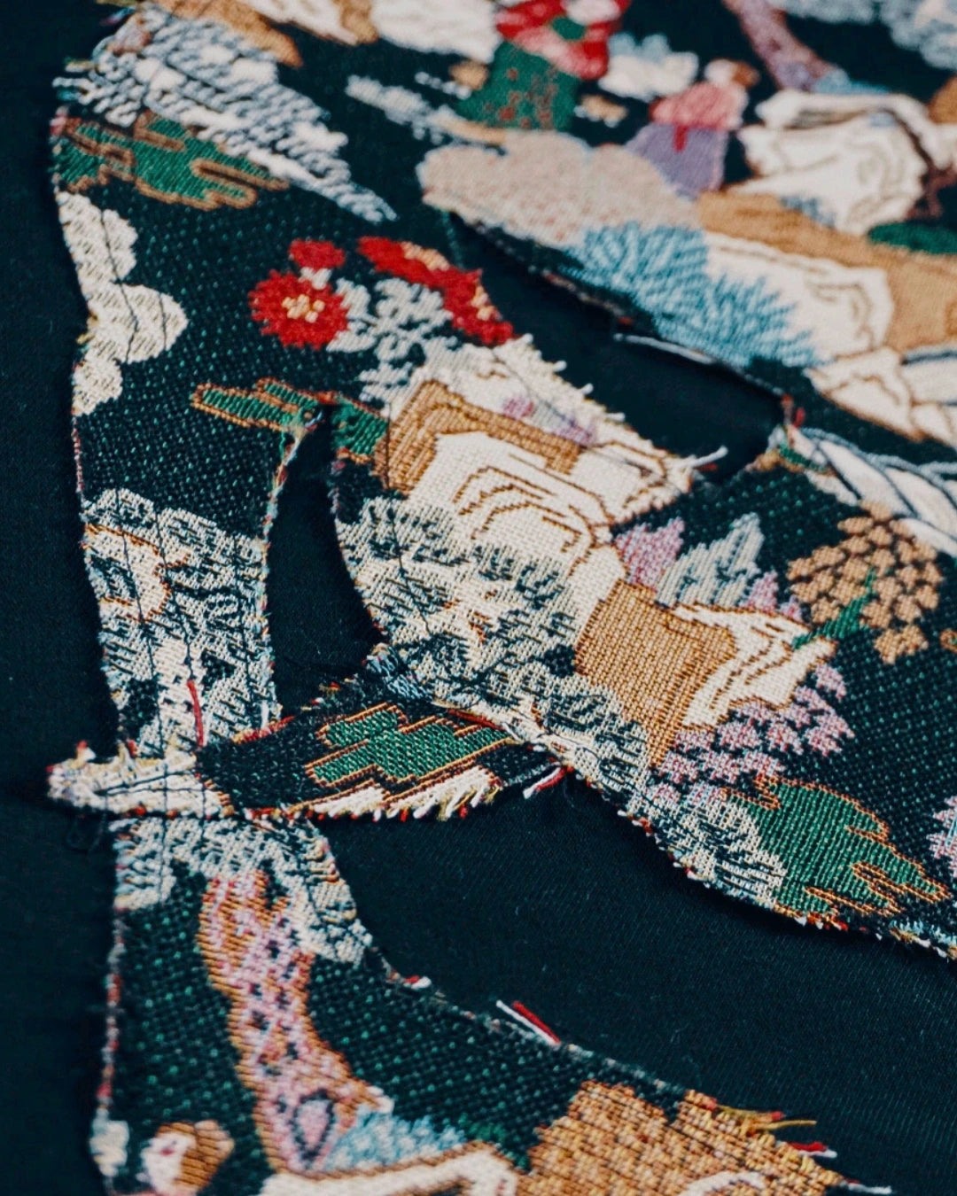 Lavorazione: Fronte: tessuto cucito con nome del brand ; Retro: maschera Oni giapponese cucita, realizzata con medesimo tessuto