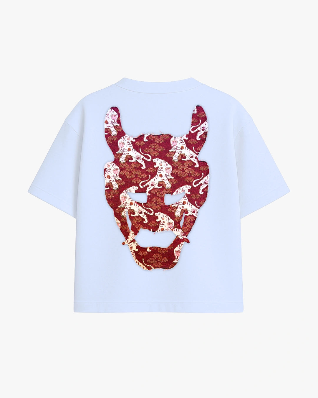 Dietro, il volto di un demone giapponese, custode di forza e trasformazione, che ti accompagna ovunque tu scelga di farti vedere.